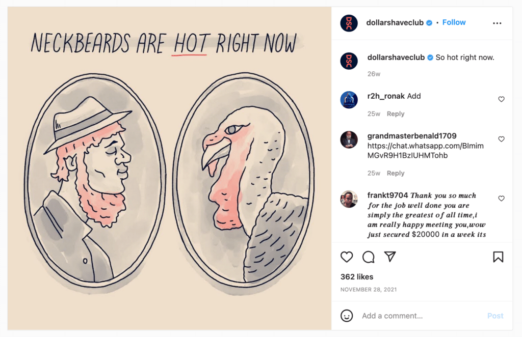 A great example of this is the following post from Dollar Shave Club: