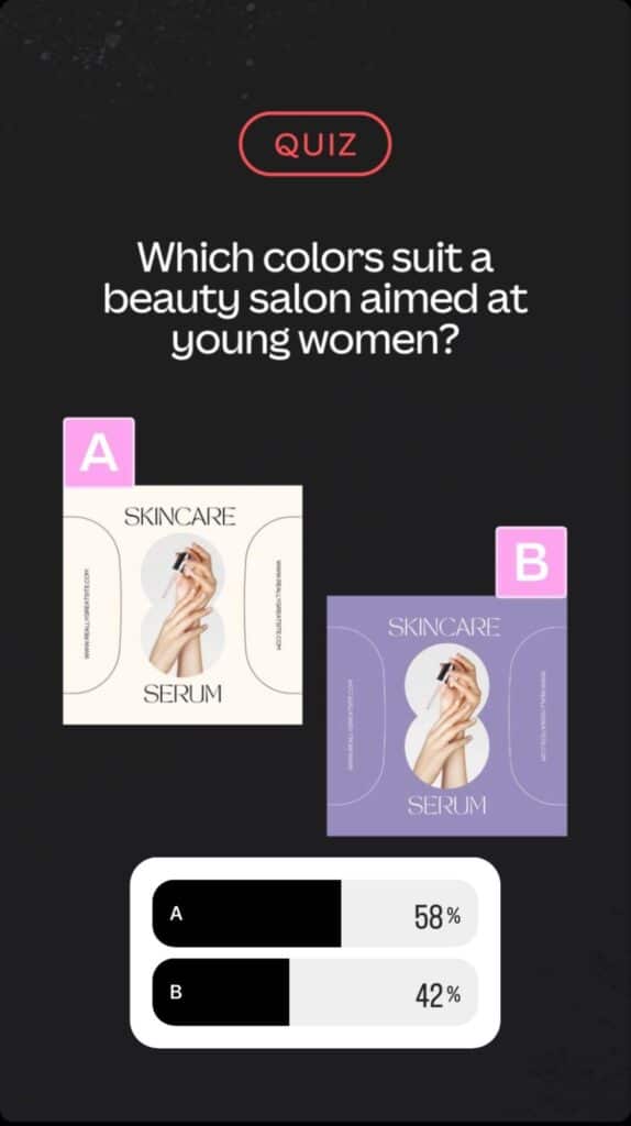 In contrast, Instagram Quizzes are used to test knowledge and usually have correct answers. They can be used to challenge your audience with questions related to your brand or industry, making the interaction both educational and engaging.