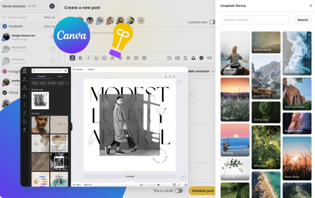 Canva integrates with social media management tools like SocialBee, which allows you to centralize all your content creation from one tab. For example, you can easily design, import, and schedule your social media graphics directly from SocialBee’s post editor.