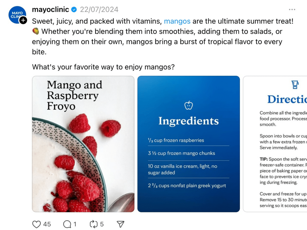 Mayo Clinic shares health tips, recipes, and practical advice in text-based posts, images, and videos. Their strategy involves great use of visual content, frequently incorporating images and videos to make their posts more appealing and easy to understand.
