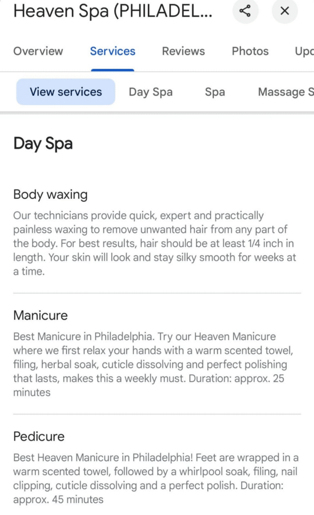 When crafting descriptions for your Google Business Profile, think about any word combinations your customers might type into Google when searching for what you offer. Include those that match your products or services. For example, if you run a spa, phrases like “body waxing” or “manicure” could be it, just like in the example below: